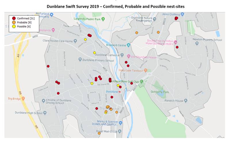 In 2019 we looked for Swift nest-sites across the Dunblane. Over 30 nest-sites were located, with scope for many others in the city. The map below shows the locations where we found nesting Swifts in 2019. We would like to hear from you if you have nesting Swifts in your building or if you know of sites where they nest.